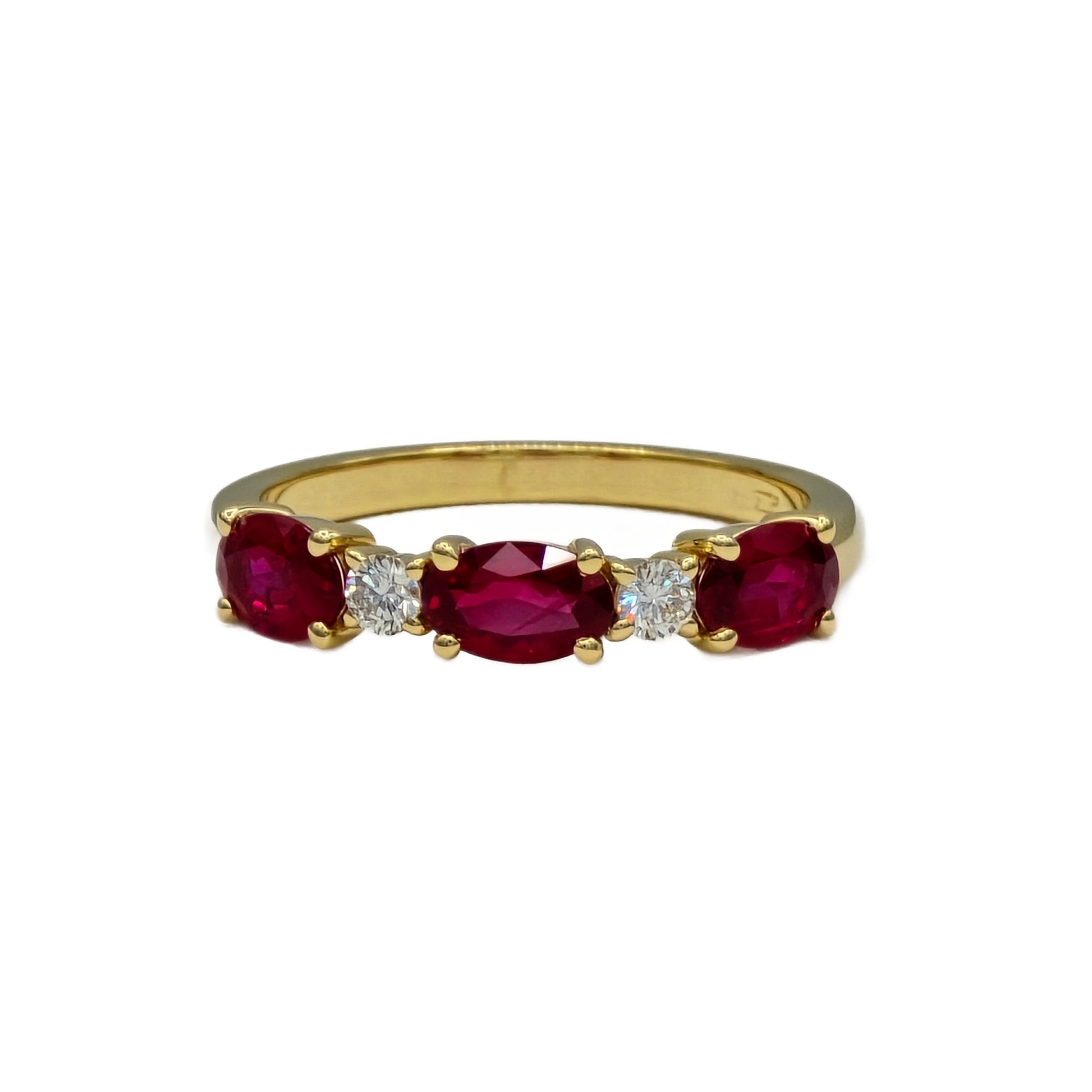 This ring has 3 oval rubies that weight 1.61 Carats in total that alternate with 2 round brilliant cut diamonds that weight 0.14 Carats in total. The mounting is made in 18K yellow gold and is currently a finger size 7 but can be made to fit any size finger.